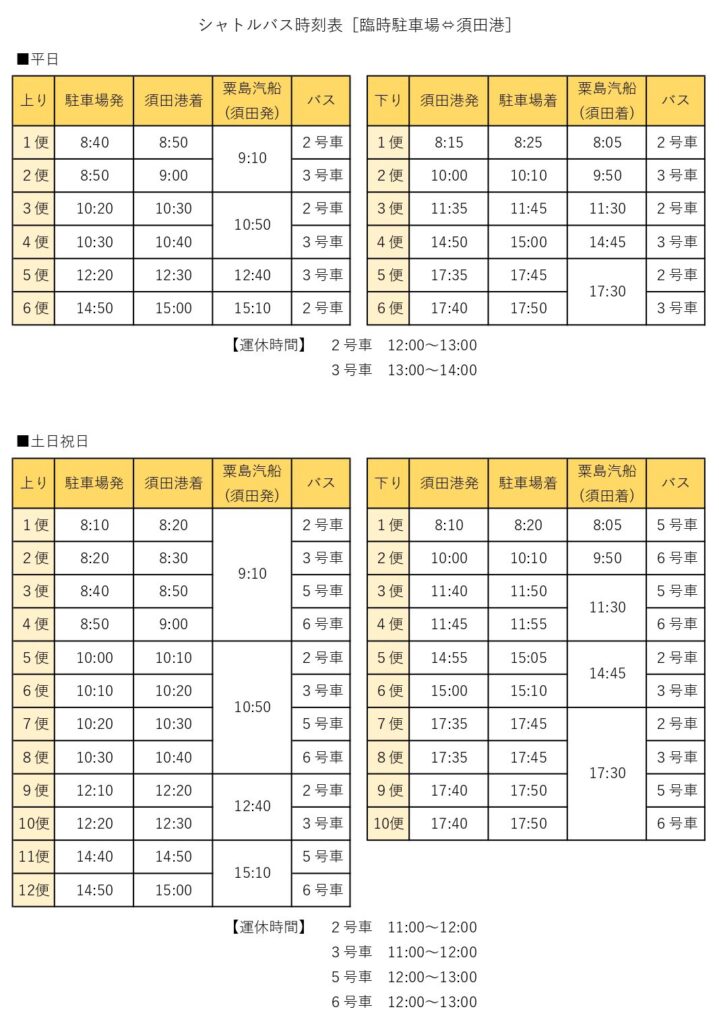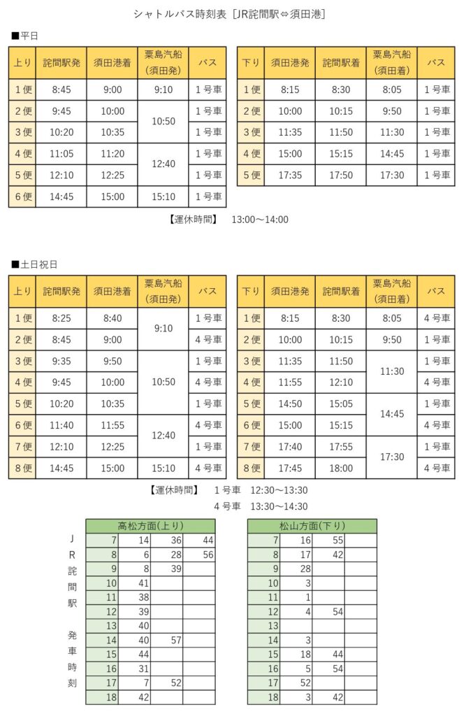 18時以降の船便で粟島港から須田港へ戻る場合は、芸術祭シャトルバスの運行が終了している時間帯のため、三豊市コミュニティバスまたはタクシーをご利用ください。