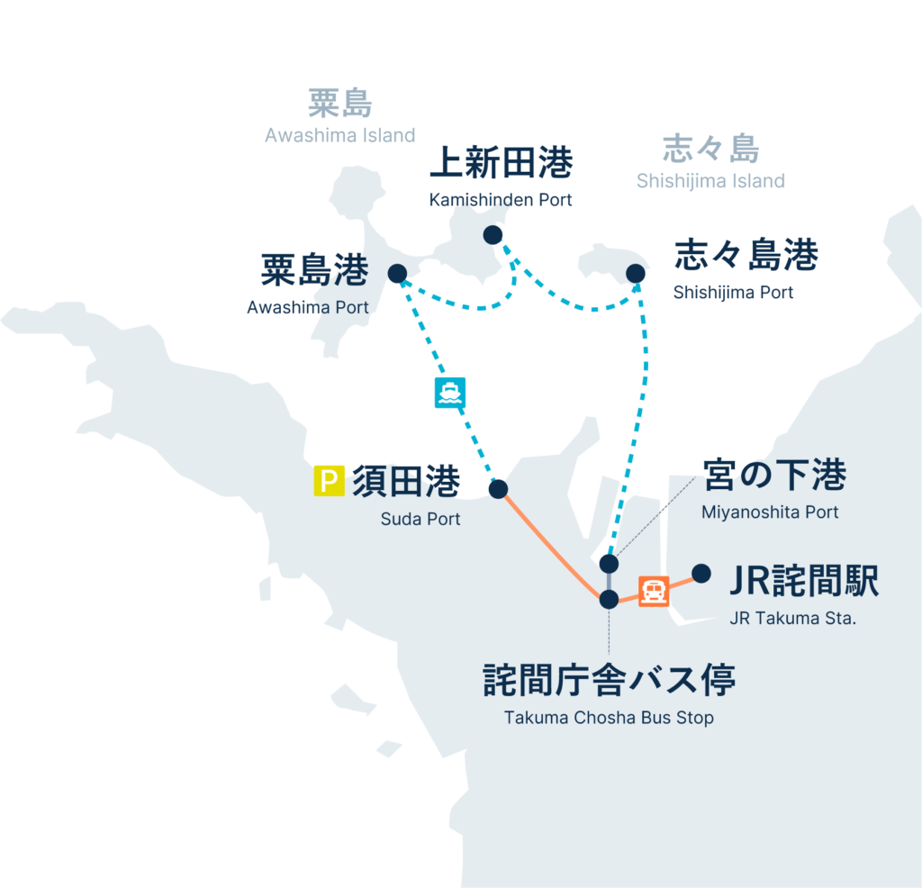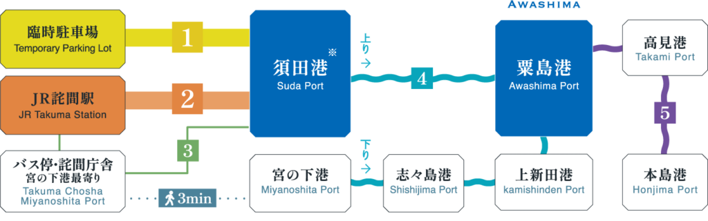 粟島へは、須田港から旅客船【4】が運行しています。芸術祭秋会期中は、お車でお越しの方向けに臨時駐車場が設置され、須田港への無料の芸術祭シャトルバス【1】が運行します。電車でお越しの方はJR詫間駅からバス【2】【3】をご利用ください。