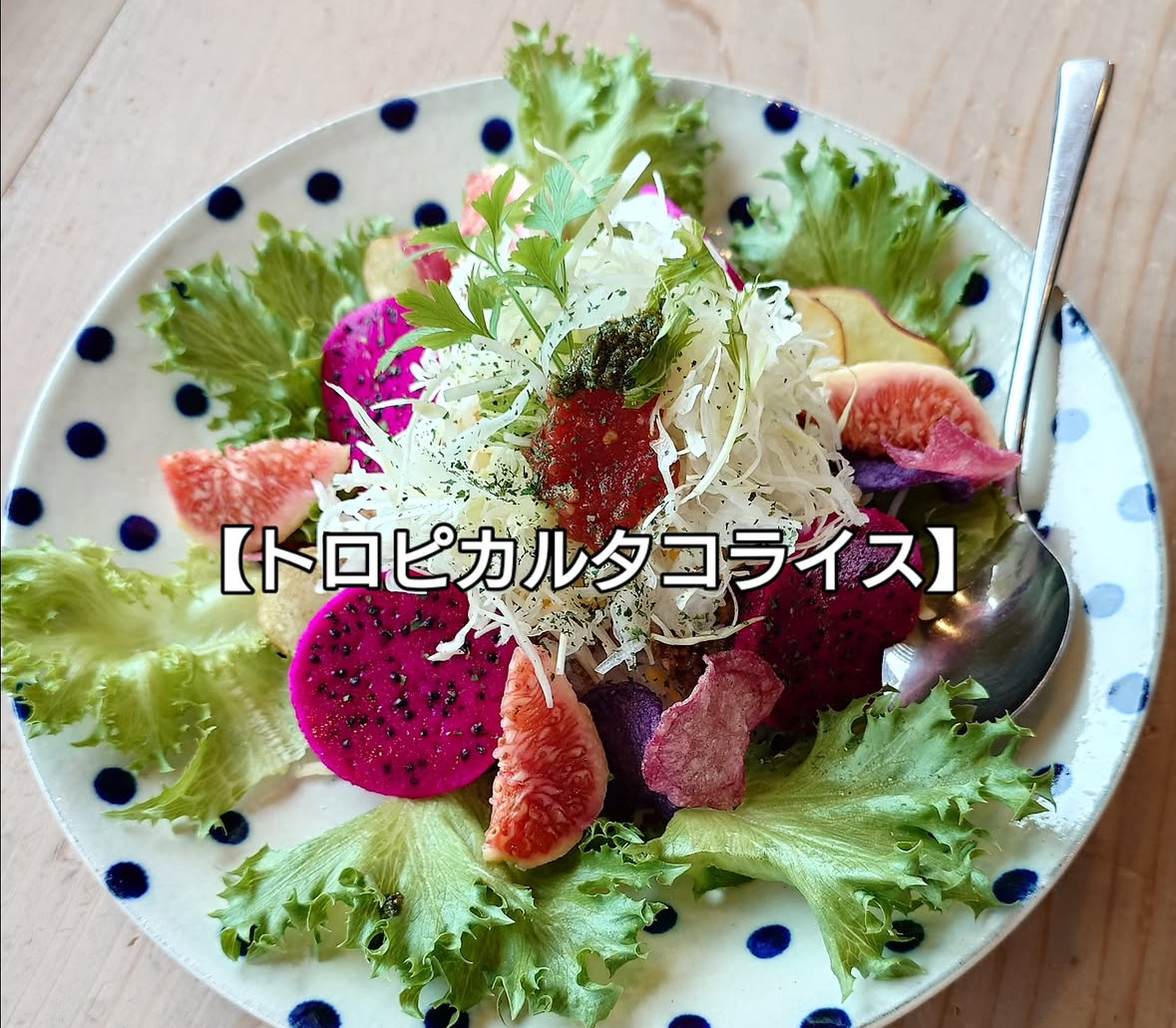 ドラゴンフルーツやイチジクなど、その時期ならではの果実と、スパイスの効いた自家製タコミート&ソース、地産野菜が織りなす、甘みと香ばしさのトロピカルマリアージュ。