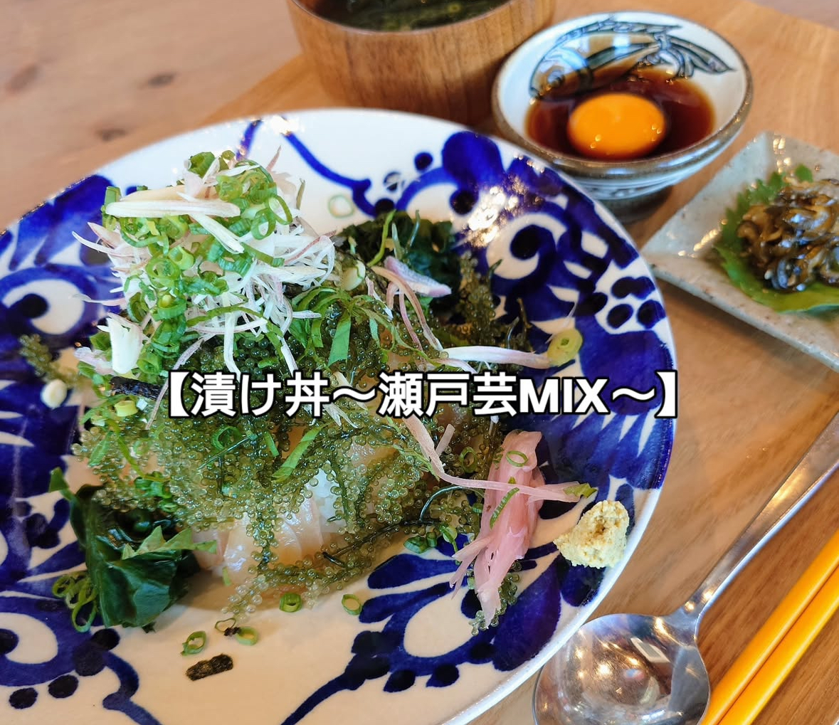 特製ダレに漬け込んだ瀬戸内の新鮮な魚と、沖縄直送の海ぶどうが共演するスペシャル丼。
