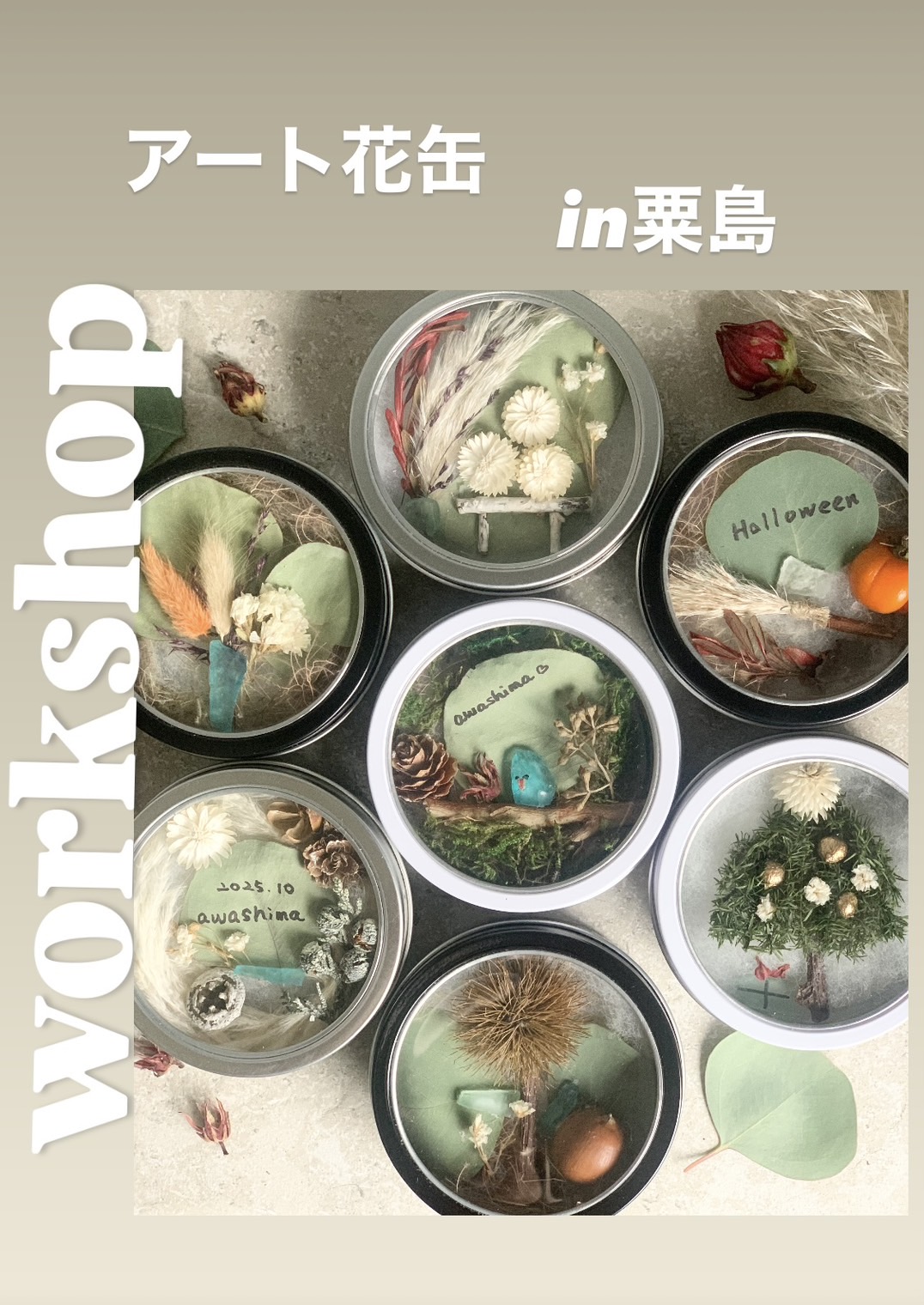 - 内容:ドライフラワーやシーグラス、木の実を使用したワークショップ「アート花缶」
