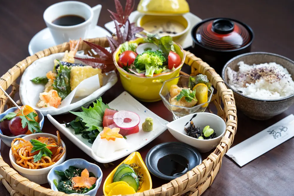 瀬戸内の魚介や地元野菜を使った美しい一皿が楽しめます。ランチの「彩り御膳」や夜のコース料理も人気です。