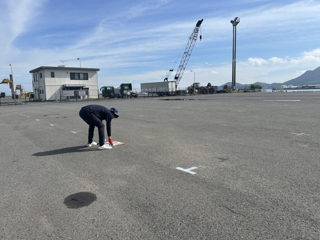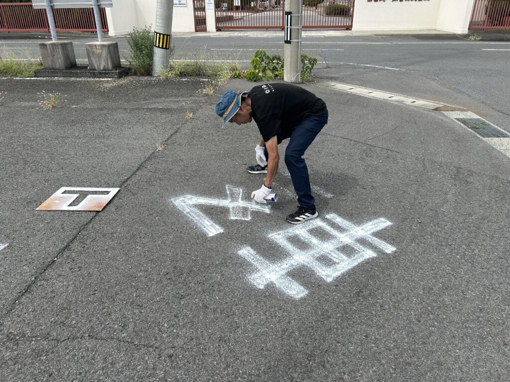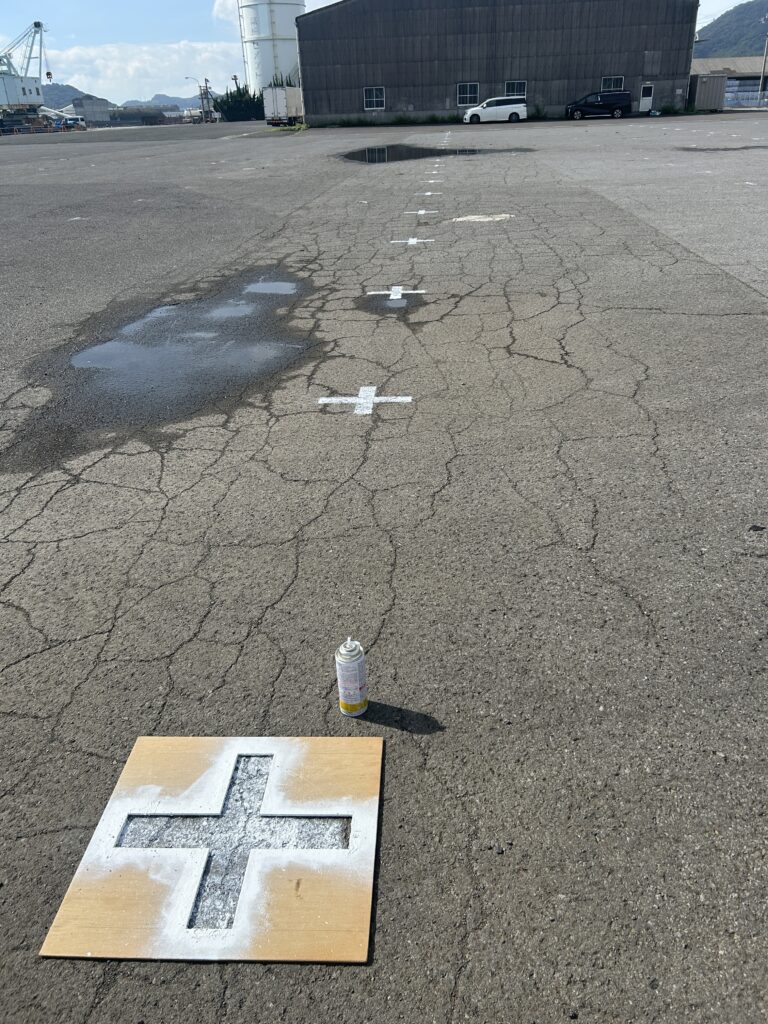 ライン引きは、瀬戸芸戦士のお父さんが加工してくれた「型枠」にスプレーでシュッと描いていくの。