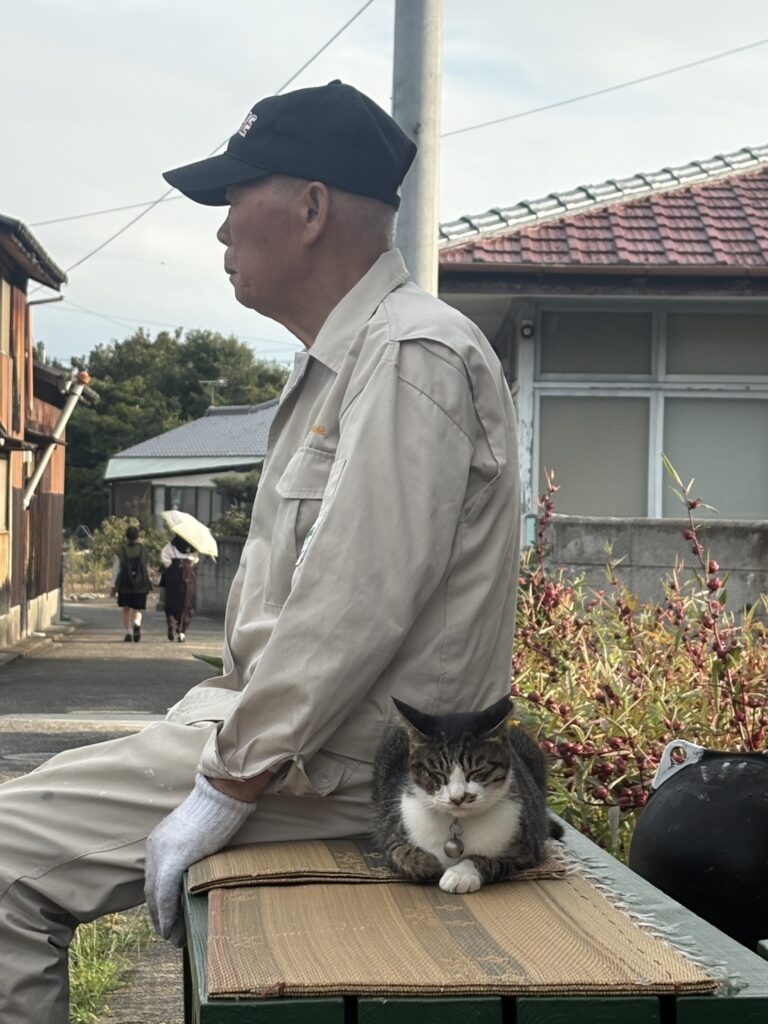 島猫と島おじさんが並んで日なたぼっこしている——